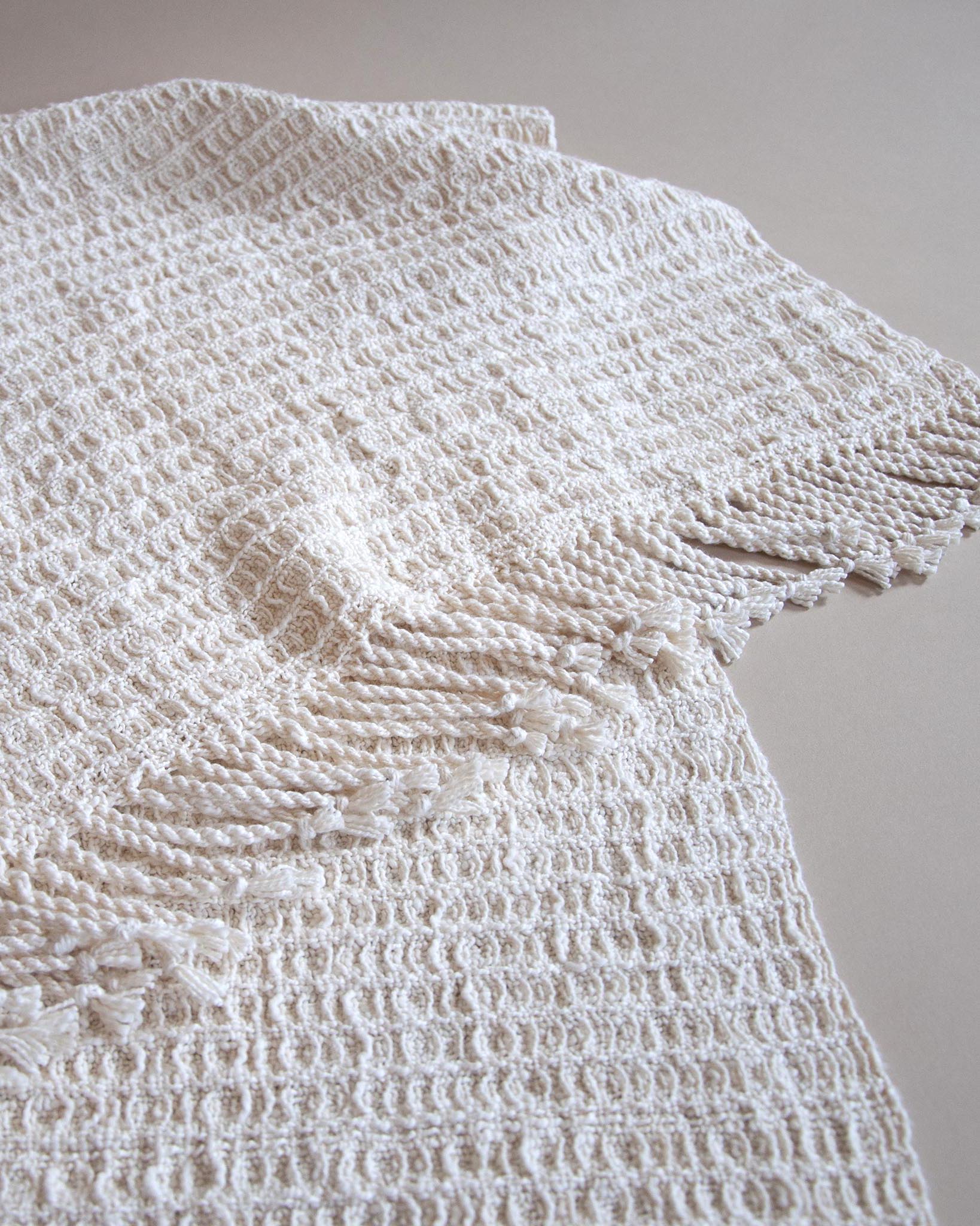 A soft and cushy waffle weave lap blanket woven with cotton slub yarn.